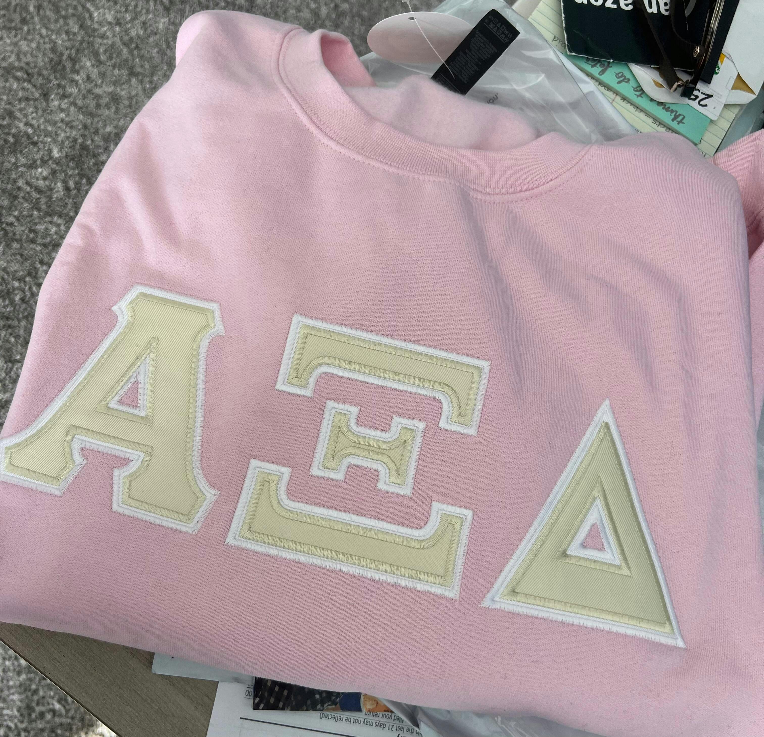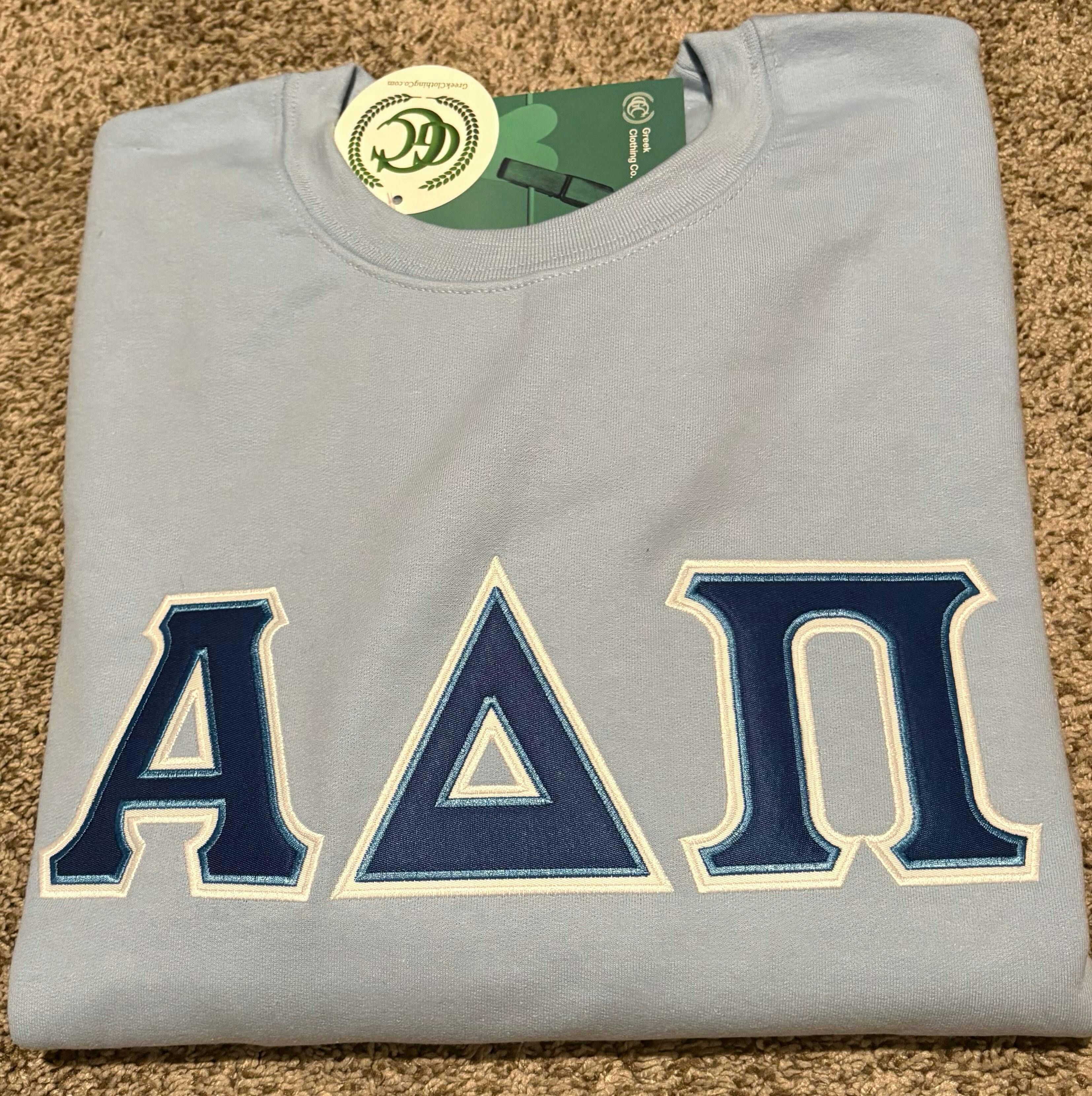 best quality of letters, stitching is amazing. REALLY fast shipping got my sweatshirt in one week for my little who just got initiated!! love greekclothingco!