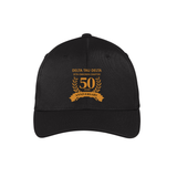 Custom embroidered Delta Tau Delta 50 year anniversary V-Flexfit Cotton Twill Cap. The hat comes in black, with the 50 Year Anniversary design embroidered in gold to commemorate the 50 year anniversary of Delta Tau Delta at the University of Central Florida.