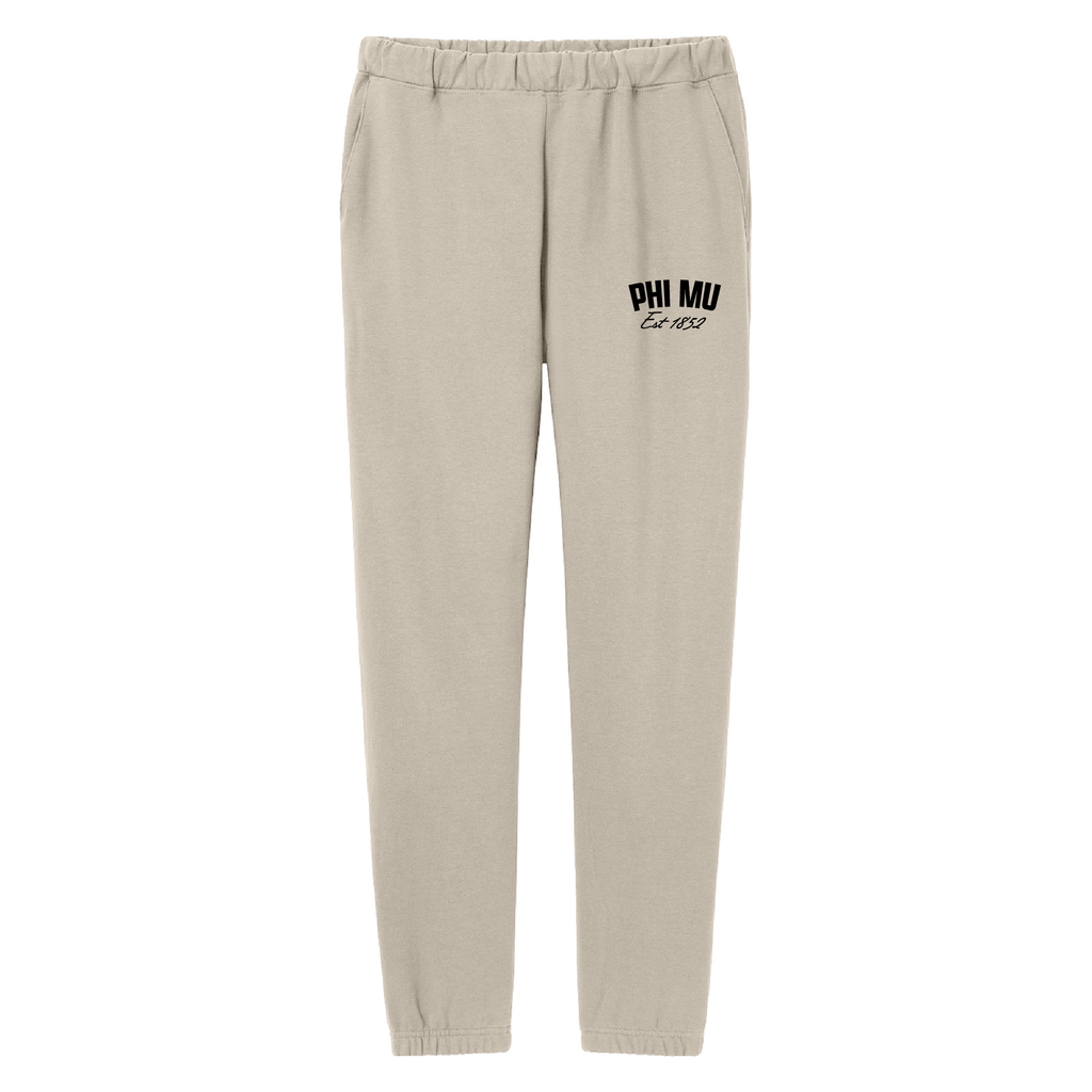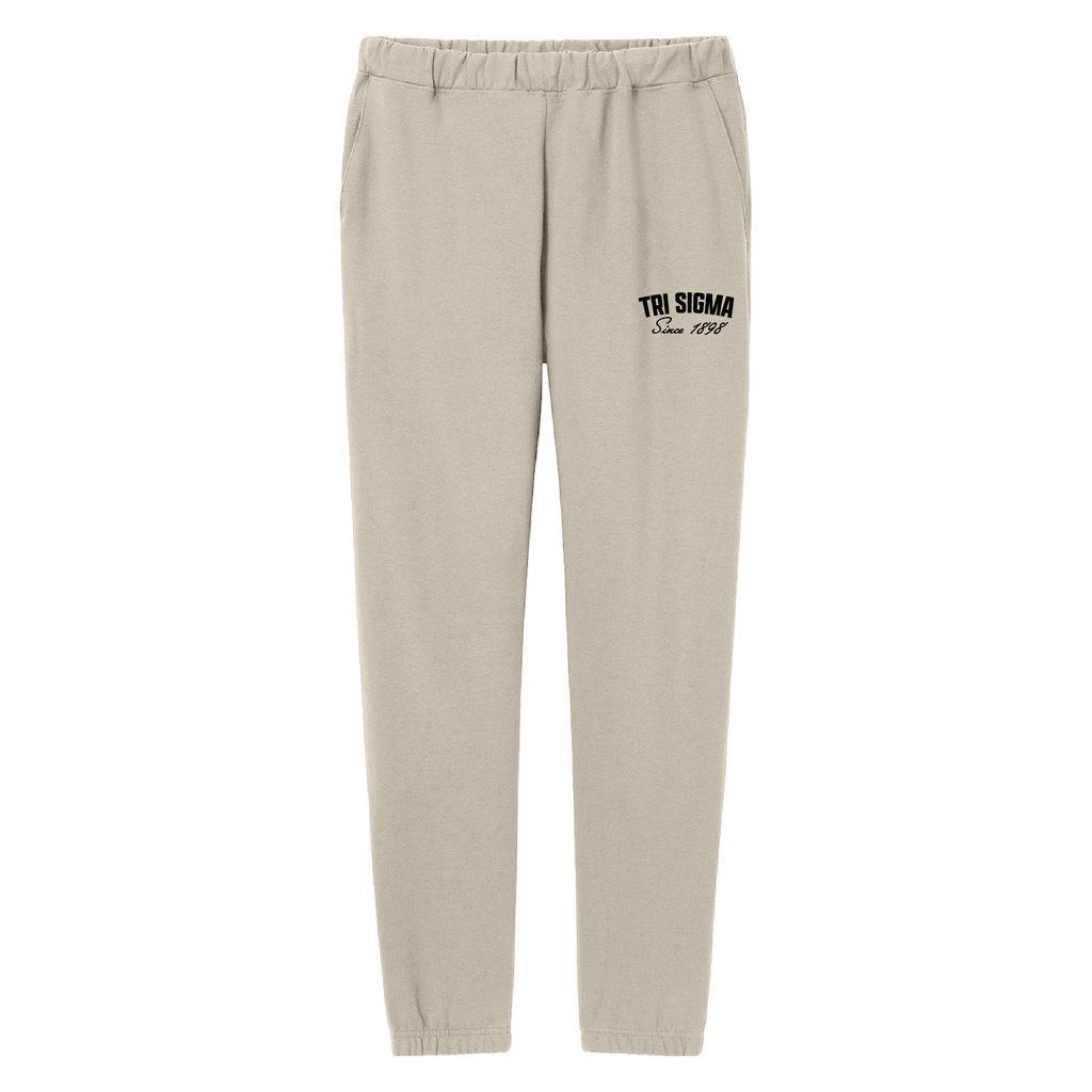 The Established Gildan sand softstyle midweight sweatpants are embroidered with your sororities name and established year on the left thigh area in black. Creating a classic look with quality embroidery, that is customizable for your sorority. The sand sweatpants are 8.4 ounce, 80/20 ring spun cotton/polyester, with a covered elastic waistband with interior white drawcords, slanted side pockets and tapered legs with elasticized cuffs.